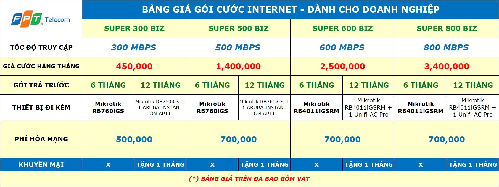 FPT Telecom mang đến các gói cước cáp quang tốc độ cao dành cho doanh nghiệp sử dụng từ 20 thiết bị trở lên, tốc độ truy cập từ 200 Mbps -> 500 Mbps